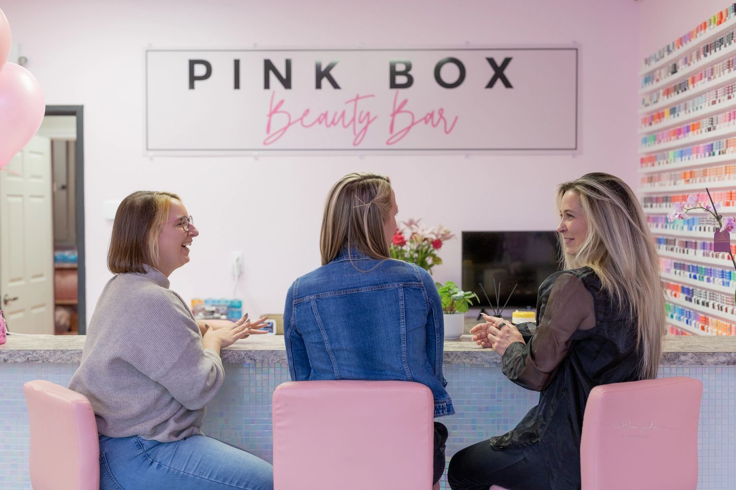 Our beautiful Beauty Bar features a spacious bar with seating for up to 7, where you can browse the 600+ colors, chat with friends, or snack and celebrate your special occasion in style. Walk the "Pink Carpet" and snap some shots in front of our #PinkBoxBB Step and Repeat.